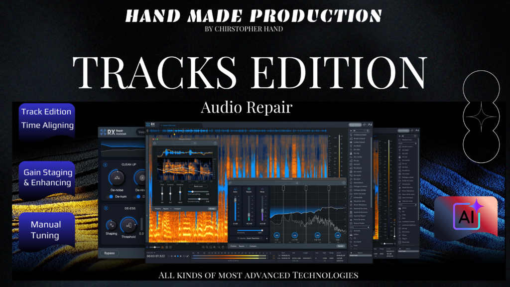 In Hand Made Production we provide full music production from idea to final track, including arrangements, full production, and sound design. Our main focus is professional mixing and mastering — clean, balanced mixes and release-ready masters for all platforms. We also offer audio editing and repair, such as vocal tuning, timing correction, noise removal, and fixing problematic tracks. If it needs to sound right, we make it sound right.